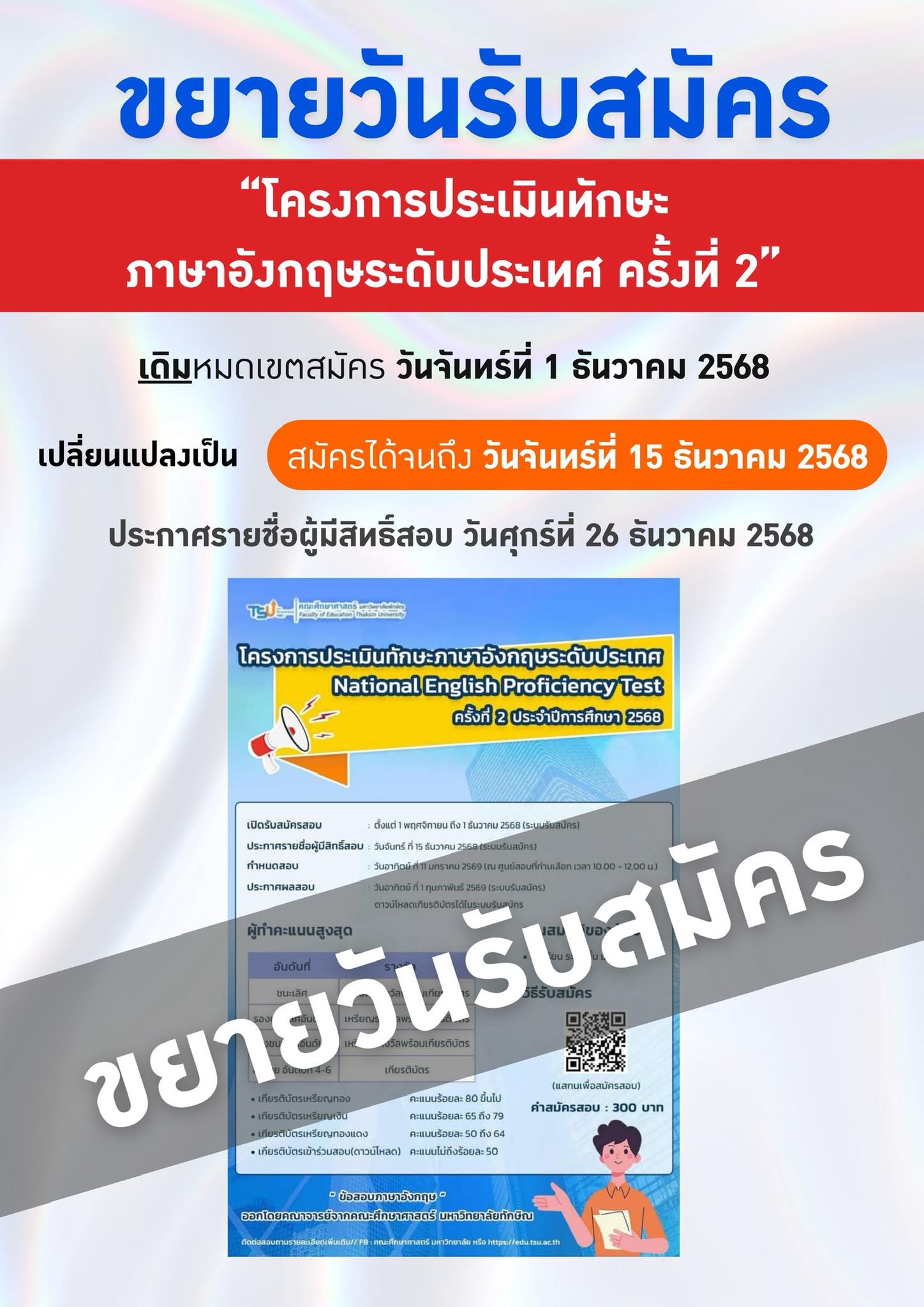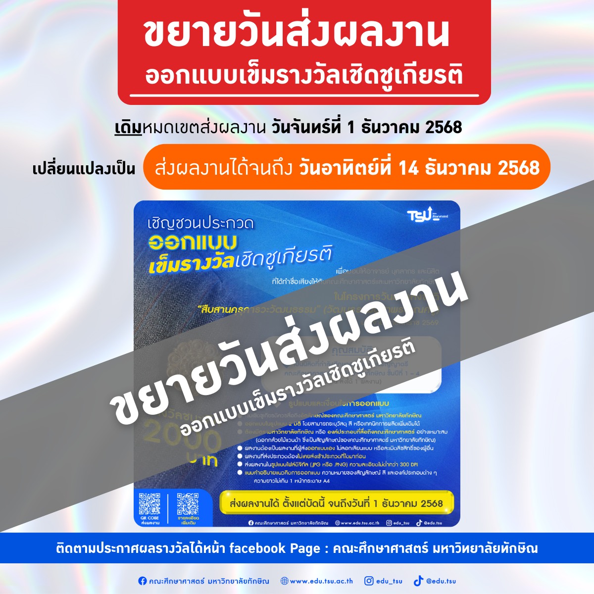 ประกาศ เพิ่มถอนรายวิชากรณีพิเศษ ภาคเรียนที่ 2 ปีการศึกษา 2568 ตั้งแต่วันที่ 11 - 17 พฤศจิกายน 2568 นิสิตต้องดำเนินการยื่นคำร้องขอเพิ่มและถอนรายวิชาต่องานทะเบียนนิสิตเท่านั้น