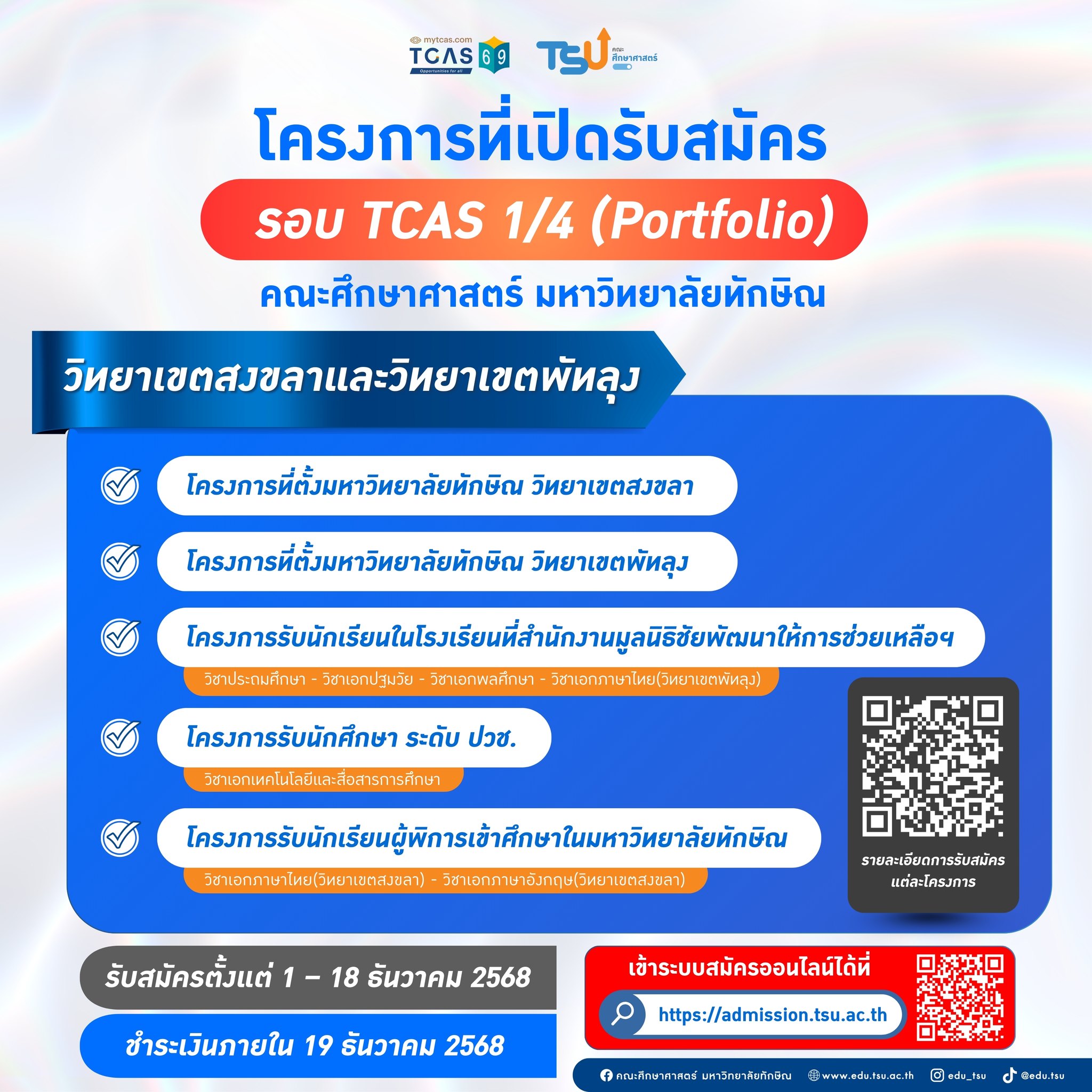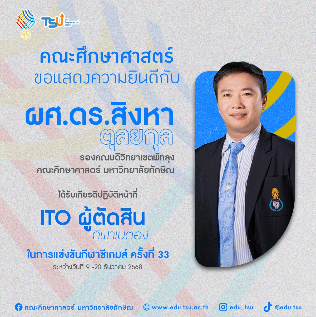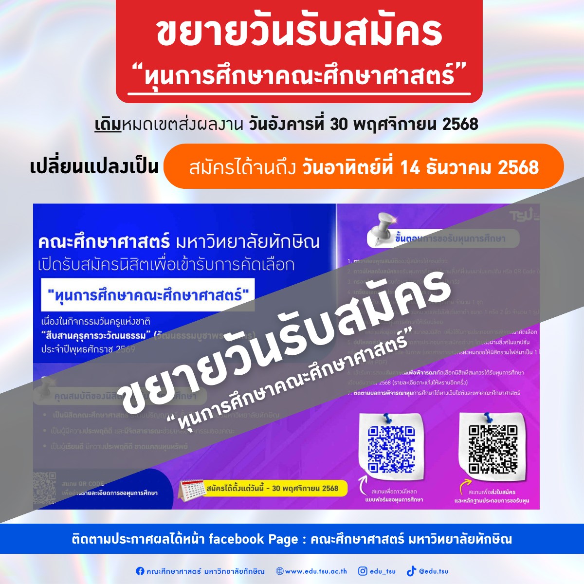คณะศึกษาศาสตร์ มหาวิทยาลัยทักษิณ เปิดรับสมัครนิสิตศึกษาศาสตร์ ทั้ง วิทยาเขตสงขลา และ วิทยาเขตพัทลุง เข้าร่วมคัดเลือก “ทุนการศึกษาคณะศึกษาศาสตร์” ร่วมสืบสานวัฒนธรรมบูชาพระคุณครู