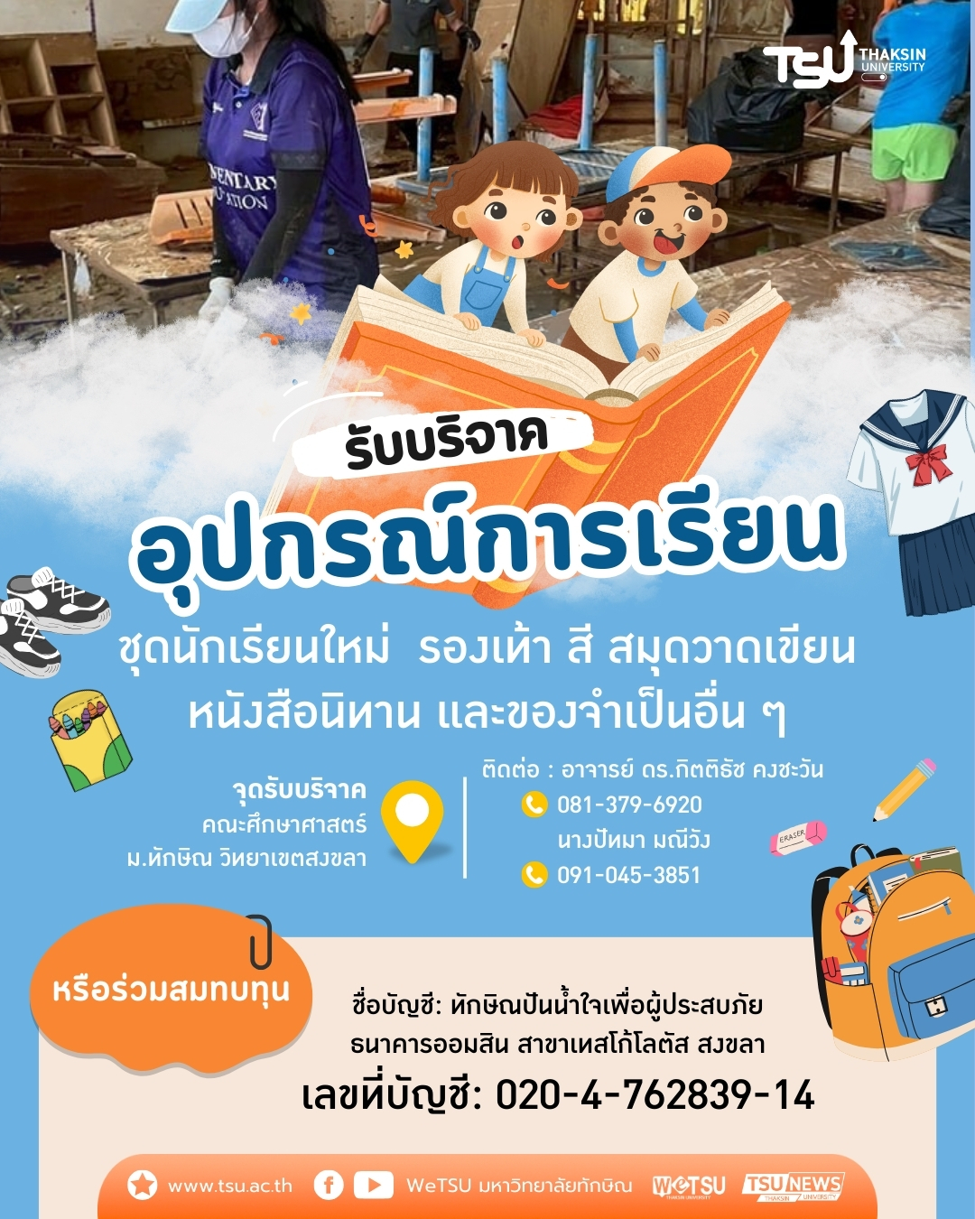 มหาวิทยาลัยทักษิณเปิดรับบริจาค อุปกรณ์การเรียน ชุดนักเรียนใหม่ รองเท้า สี สมุด ปากกา หนังสือนิทาน และของจำเป็นอื่น ๆ เพื่อมอบให้เด็ก ๆ ที่กำลังจะกลับเข้าสู่ห้องเรียนอีกครั้ง