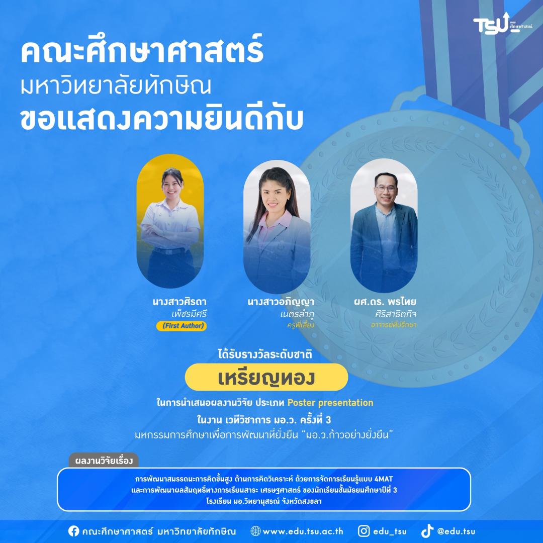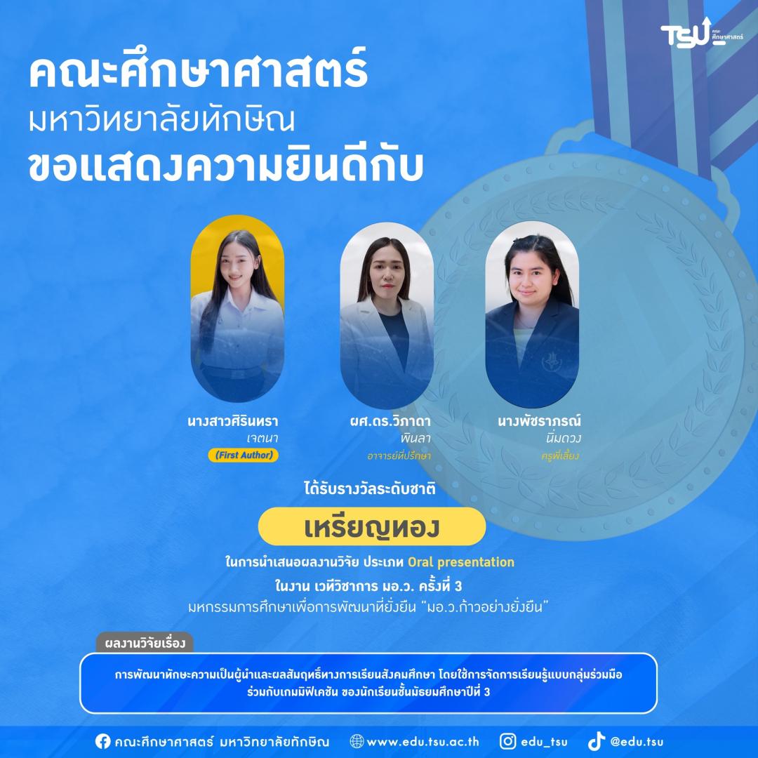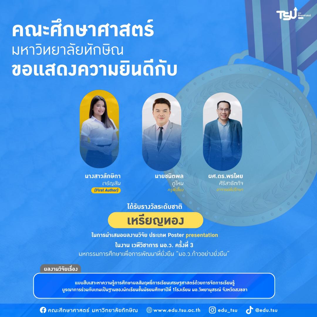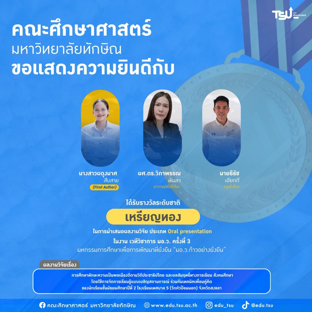 ขอแสดงความยินดีอย่างยิ่ง คณะศึกษาศาสตร์ มหาวิทยาลัยทักษิณ ขอแสดงความยินดีกับนิสิตและคณาจารย์ ในโอกาสได้รับ รางวัลระดับชาติ เหรียญทอง จากการนำเสนอผลงานวิจัย ในงานเวทีวิชาการ มอว. ครั้งที่ 3