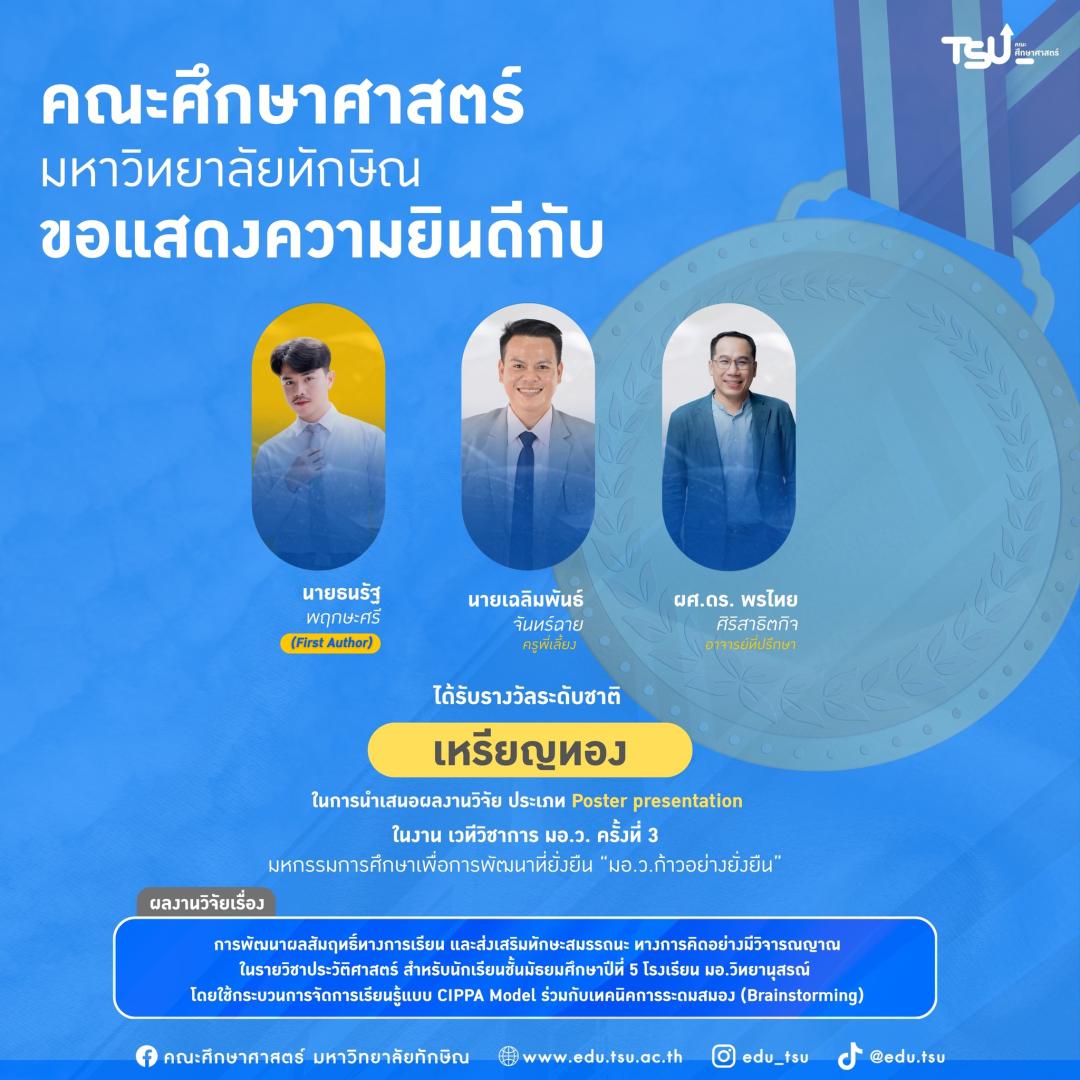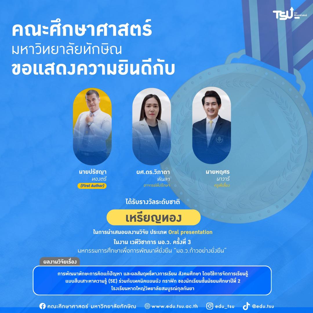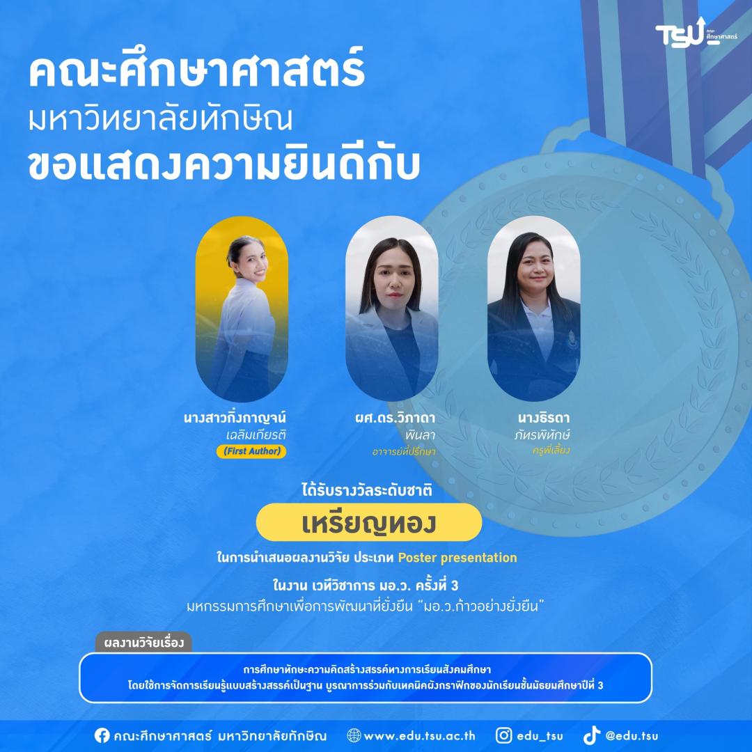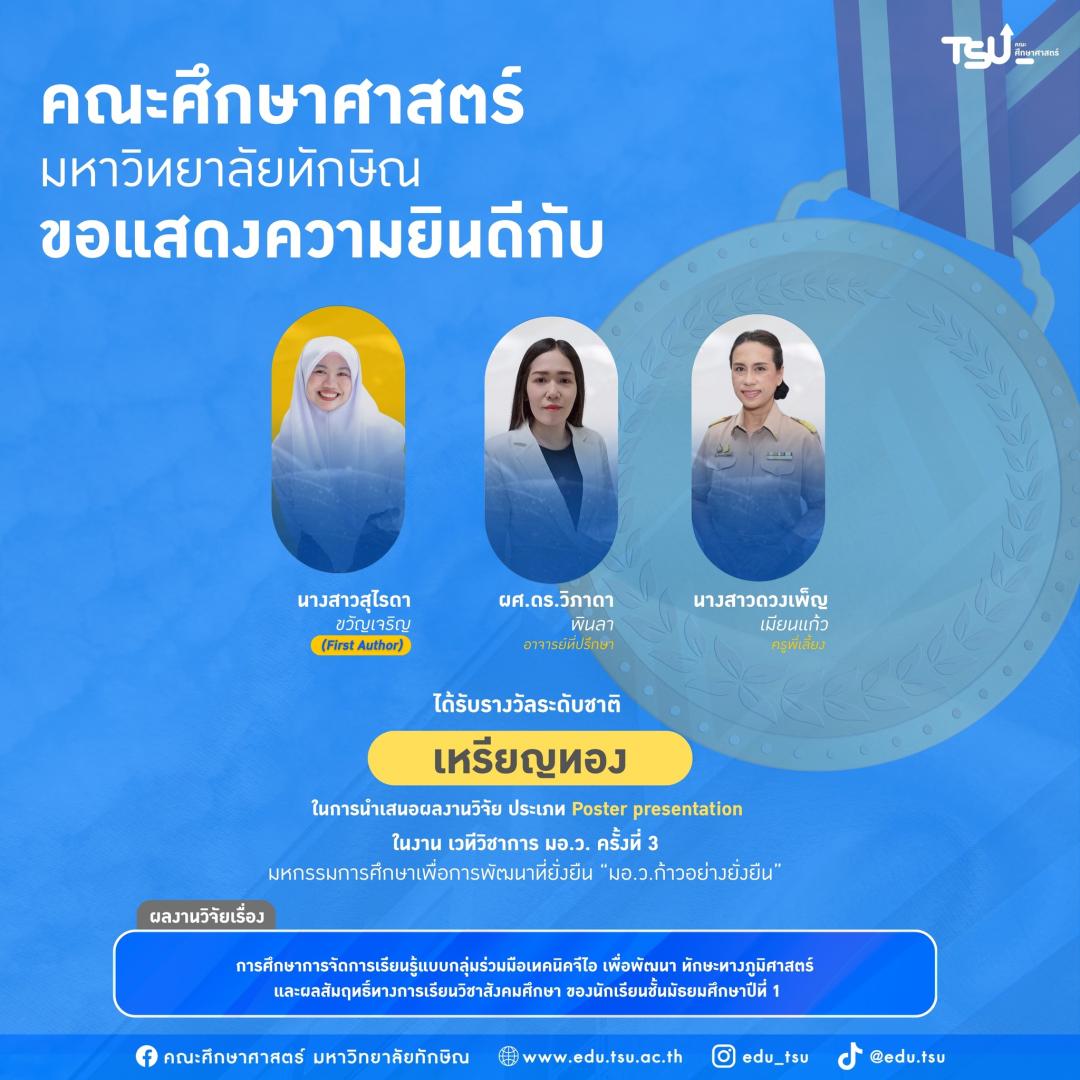 ขอแสดงความยินดีอย่างยิ่ง คณะศึกษาศาสตร์ มหาวิทยาลัยทักษิณ ขอแสดงความยินดีกับนิสิตและคณาจารย์ ในโอกาสได้รับ รางวัลระดับชาติ เหรียญทอง จากการนำเสนอผลงานวิจัย ในงานเวทีวิชาการ มอว. ครั้งที่ 3
