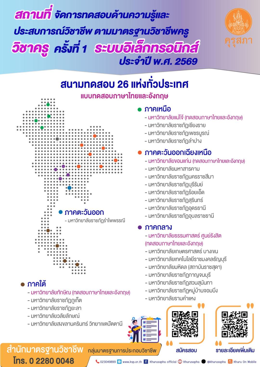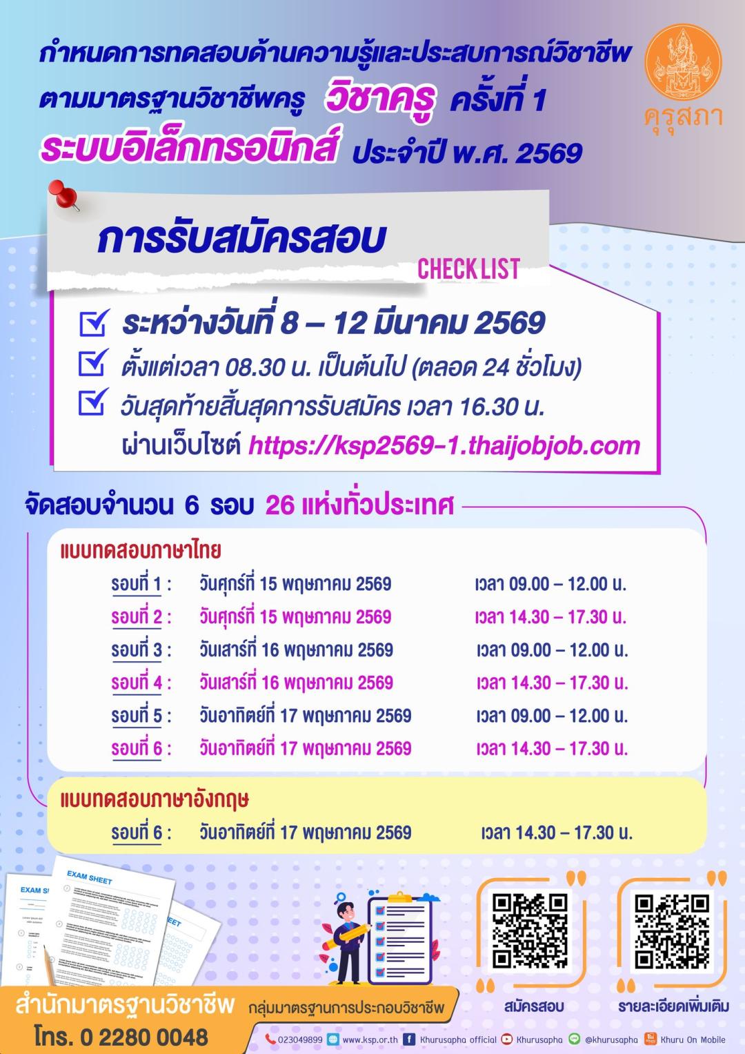 คุรุสภาเปิดรับสมัครการเข้ารับการทดสอบด้านความรู้และประสบการณ์วิชาชีพ ตามมาตรฐานวิชาชีพครู วิชาครู ครั้งที่ 1 ระบบอิเล็กทรอนิกส์ ประจำปี พ.ศ. 2569