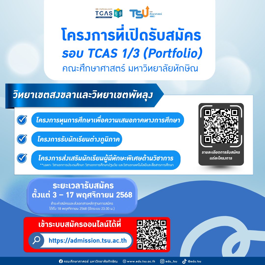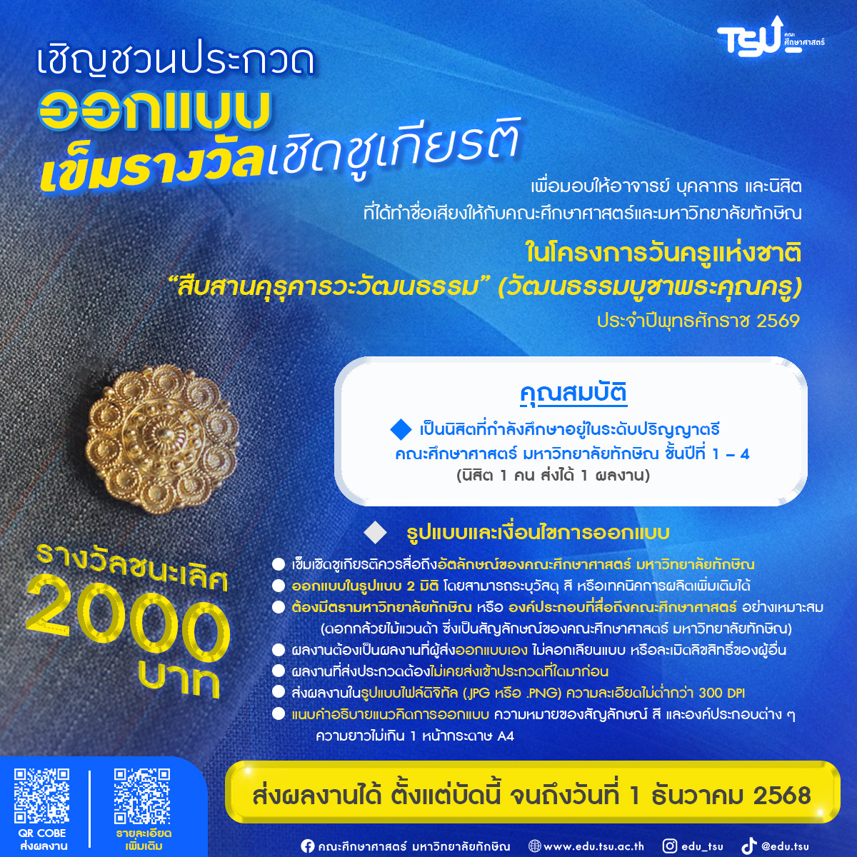 คณะศึกษาศาสตร์ มหาวิทยาลัยทักษิณ เปิดรับสมัครนิสิตศึกษาศาสตร์ ทั้ง วิทยาเขตสงขลา และ วิทยาเขตพัทลุง เข้าร่วมคัดเลือก “ทุนการศึกษาคณะศึกษาศาสตร์” ร่วมสืบสานวัฒนธรรมบูชาพระคุณครู