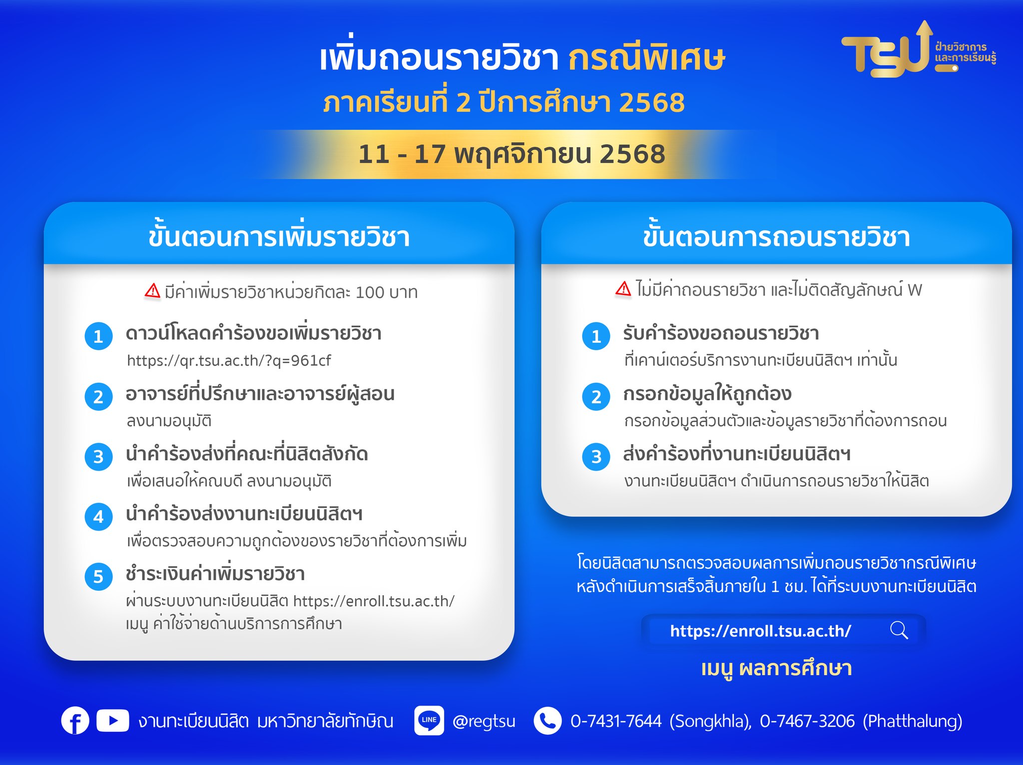ประกาศ เพิ่มถอนรายวิชากรณีพิเศษ ภาคเรียนที่ 2 ปีการศึกษา 2568 ตั้งแต่วันที่ 11 - 17 พฤศจิกายน 2568 นิสิตต้องดำเนินการยื่นคำร้องขอเพิ่มและถอนรายวิชาต่องานทะเบียนนิสิตเท่านั้น